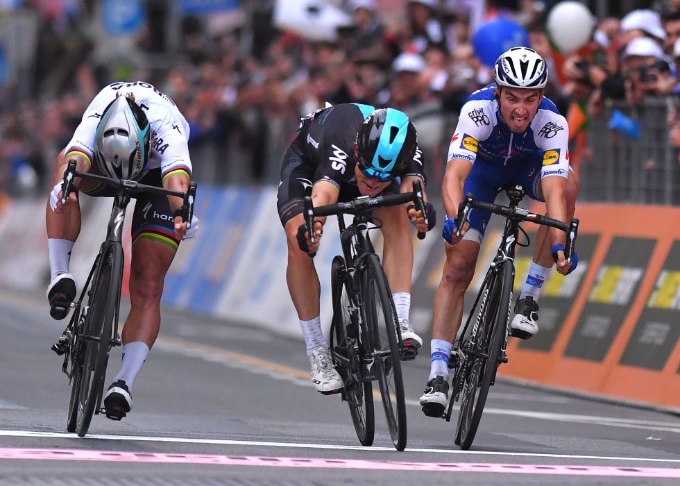 Anført av Sagan stupte den sterke trioen ned mot Via Roma i et forrykende tempo, mens Bahrain-Merida ledet jakten i feltet. Avstanden gikk opp til elleve sekunder før de siste tre kilometerne, men ingenting var avgjort idet FDJ også jobbet hardt.