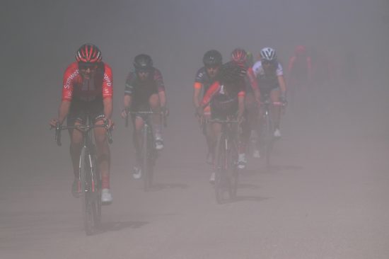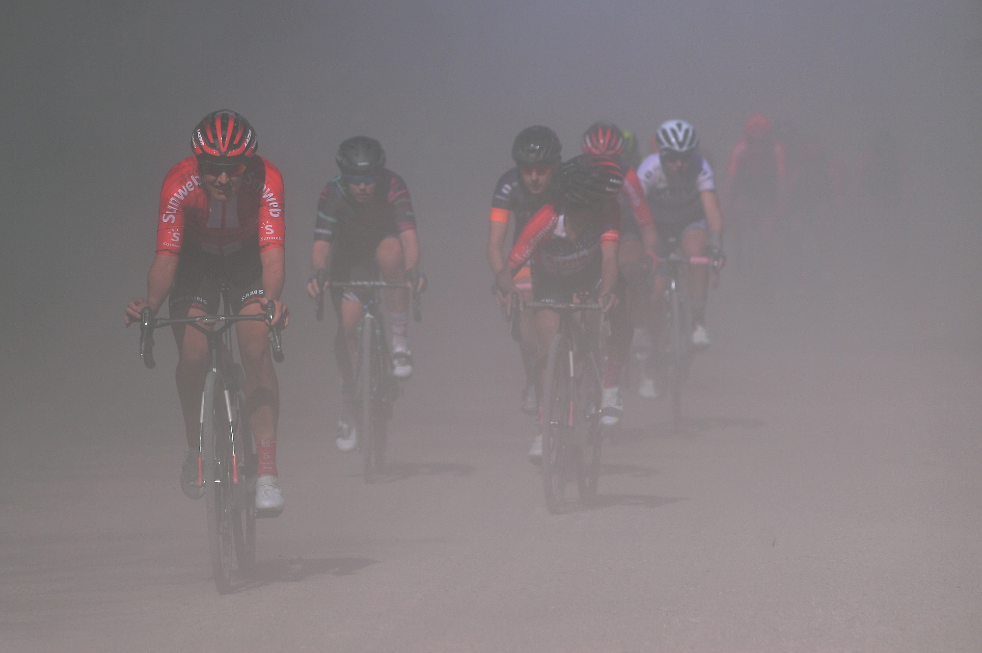 STØVKAOS: Med mange kjøretøy foran seg var det av og til dårlig sikt for rytterne. Her Lucinda Brand i teten. Foto: Luc Claessen/Getty Images