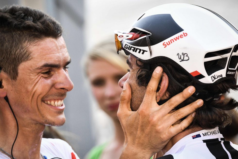 ROMKAMERATER: Warren Barguil (t.v) gratulerer Michael Matthews etter at sistnevnte vant den 16. etappen. Foto: / AFP PHOTO / Lionel BONAVENTURE