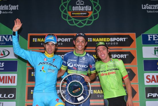 IKKE FOR OSS: Diego Rosa, Esteban Chaves og Rigoberto Uran utkjempet en heroisk kamp for å tråkke opp på podiet i Lombardia i fjor. Denne gangen forløper rittet uten norske innslag. FOTO: Tim De Waele/TDWSPORT.COM