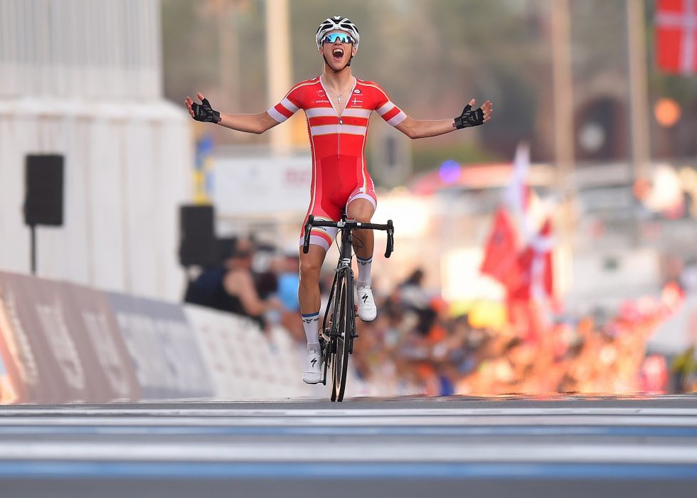 En annen dansk verdensmester, Mikkel Bjerg, sykler for samme lag.