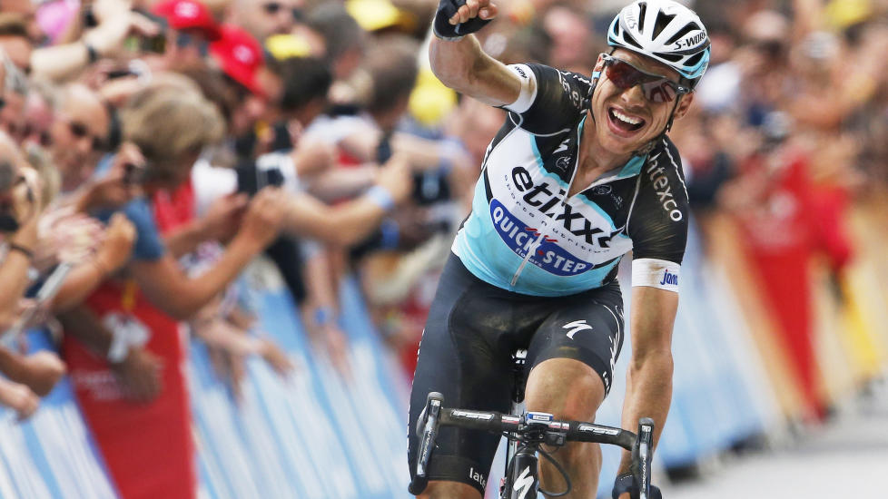 ENDELIG SATT DEN: Tony Martin kunne juble for etappeseier og gul ledertrøye etter den fjerde etappen av Tour de France. Foto: Benoit Tessier / Reuters / NTB Scanpix