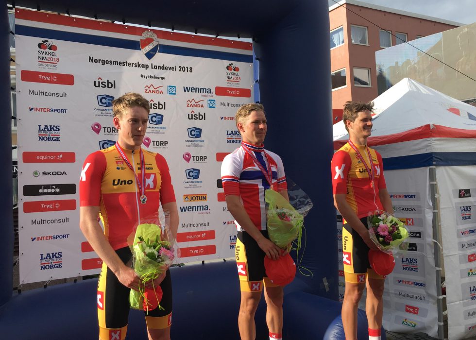 DOMINERTE: Uno-X tok kontroll fra start og sikret til slutt NM-gullet i Sandefjord. Fra venstre Iver Skaarseth, Torjus Sleen og Syver Wærsted. FOTO: Jarle Fredagsvik, procycling.no