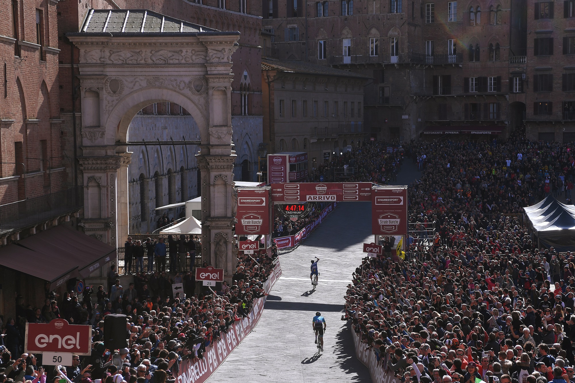 STRÅLTE: Alaphilippe hold følget opp bakken, og passerte Fuglsang på gjennom de smale gatene inn mot Piazza del Campo. Foto: Luc Claessen/Getty Images