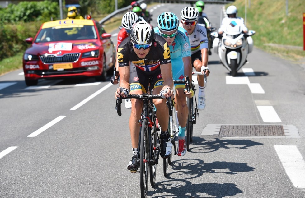 Vi er litt usikre når vi ser at Edvald Boasson Hagen blir sendt i brudd fra start av på en etappe hvor det er en første- og en HC-kategorisert bakke mot slutten. Det er en defensiv tilnærming.