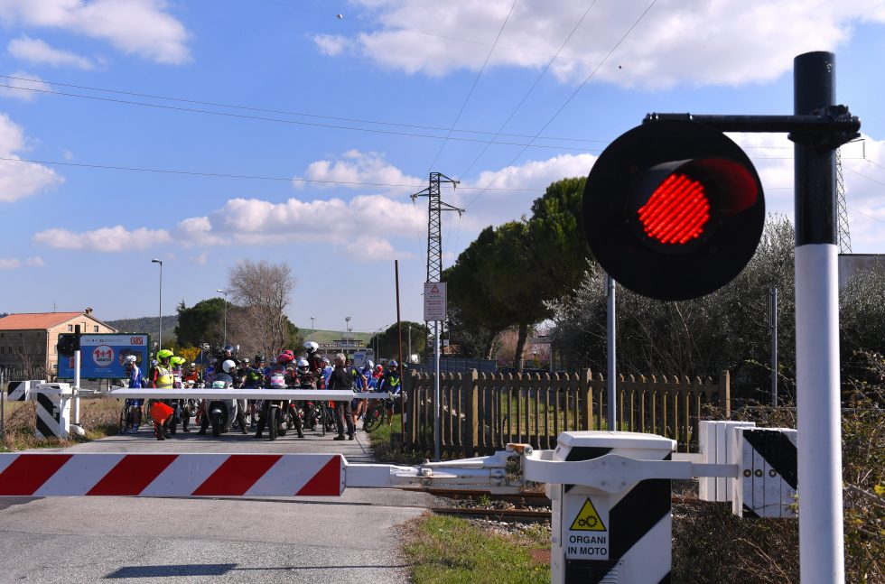 UVENTET STOPP: Hovedfeltet må vente på toget mens bruddet suser avgårde. Juryen skulle be bruddet vente også. Foto: Tim de Waele (©TDWSport.com)