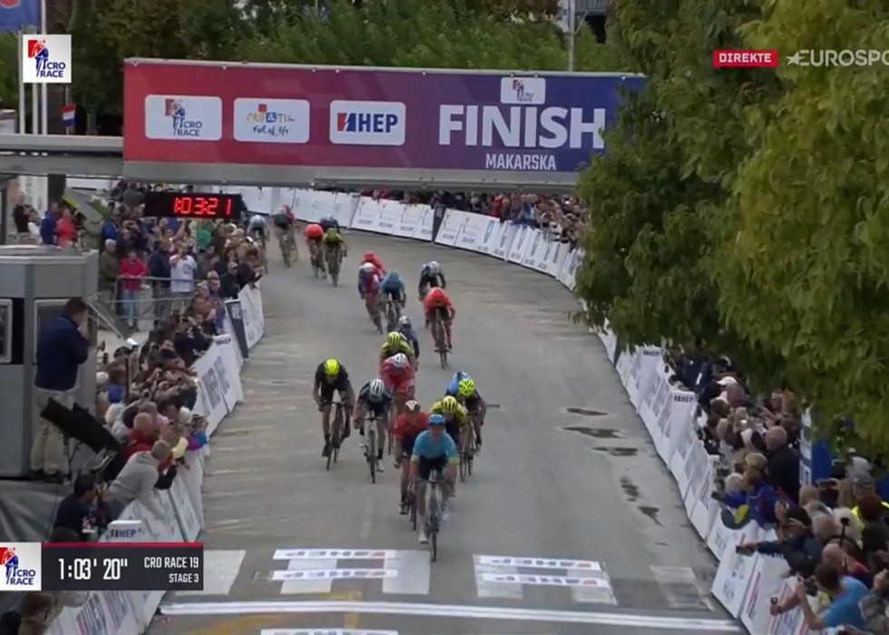 Derfra gikk det raskt nedover mot målbyen Makarska, men de fikk besøk av flere ryttere i utforkjøringen. Sammenlagtleder Eduard Grosu (Delko Marseille Provence) var blant dem som ikke kom opp igjen, men det ble til slutt en spurt om etappeseieren fra en gruppe på rundt 25 ryttere.