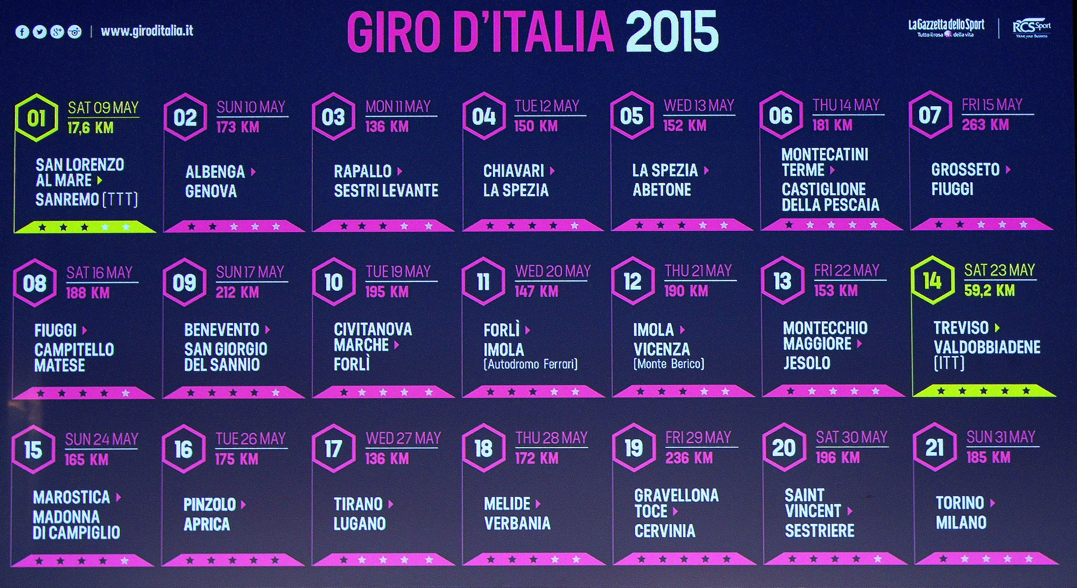 Årets Corsa Rosa vil bestå av færre fjelltoppavslutninger enn tidligere. Etter ni toppavslutninger i fjorårets Giro, har vi en mer human utgave i vente denne gang. Seks fjellavslutninger (hvorav fire i høyfjellet) og to bakkeavslutninger står på plakaten – med de tøffeste som vanlig penslet inn i siste avgjørende uke. Selv uten Stelvio, Gavia og Zoncolan blir de utslagsgivende etappene strabasiøse, tøffe og ekstremt trettende – hvilket er i tråd med Giroens stolte selvbilde som «det hardeste rittet i verden, satt i verdens vakreste omgivelser». Gigantene Colle delle Finestre og Passo del Mortirolo for eksempel, vil sette skrekken i selv de mest spesialiserte fjellgeitene.