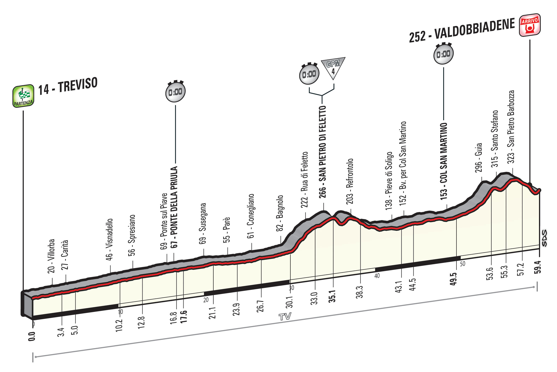 Rittets eneste individuelle tempo starter i Treviso, til ære for nylig avdødde Giovanni Pinarello. Sykkelprodusenten har sitt hovedkvarter i byen.