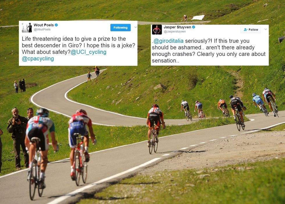 – Livsfarlig idé å gi en pris til den beste utforkjøreren i giroen? Jeg håper dette er en spøk? Hva med sikkerheten? skriver Team Skys Wout Poels.