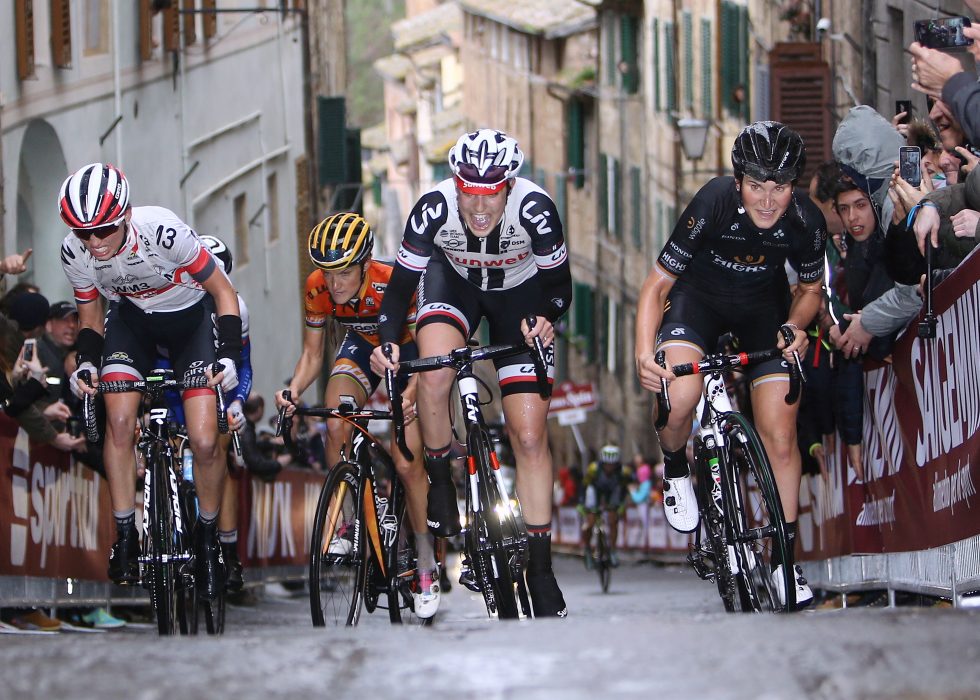 KVINNEFELTET: En dramatisk finale i Siena under damenes Strade Bianchie tidligere i år. (©TDWSport.com)
