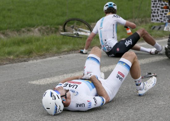 VELTET: Alexander Kristoff lå i favorittgruppen foran Mons-enPévèle, men veltet dessverre. FOTO: EPA/ETIENNE LAURENT