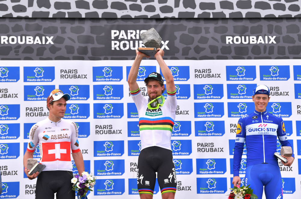 PODIET: Peter Sagan med beviset på seieren, med Silvan Dillier og Niki Terpstra på pallen med seg. FOTO: Tim de Waele (TDWSport.com)