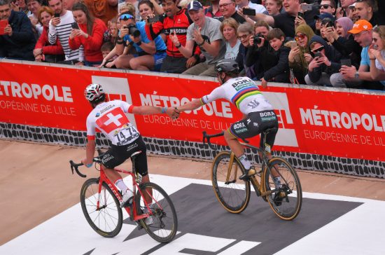 HANDSHAKE: Silvan Dillier og Peter Sagan slenger ut en anerkjennede hånd til hverandre. FOTO: Tim de Waele (TDWSport.com)
