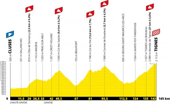 Før den avsluttende klatringen skal rytterne igjennom fire kategoriserte klatringer, deriblant 12 kilometer lange Col du Pré, før man fortsetter videre opp til Cormet de Roselend.