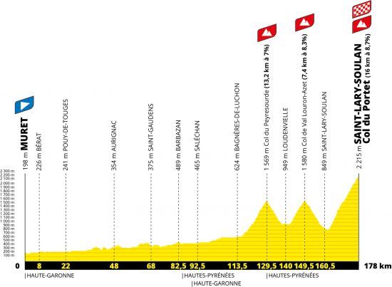 I år skal imidlertid rytterne sykle 113 kilometer før man tar fatt på de tre klatringene Col de Peyresourde, Col de Val Louron-Azet, før den tøffe klatringen opp Col du Portet. Den 16 kilometer lange klatringen har en snittprosent på 8.