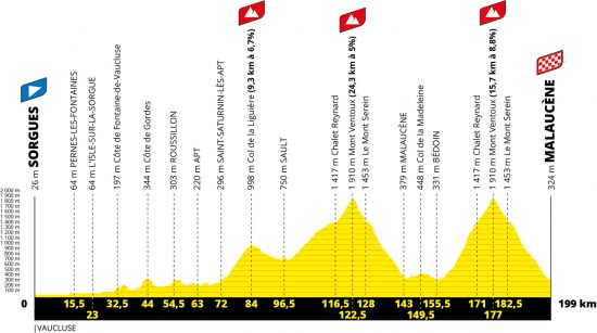 Målgang er imidlertid ikke lagt til toppen av «Giganten av Provence», men i bunnen av utforkjøringen i Malaucène.