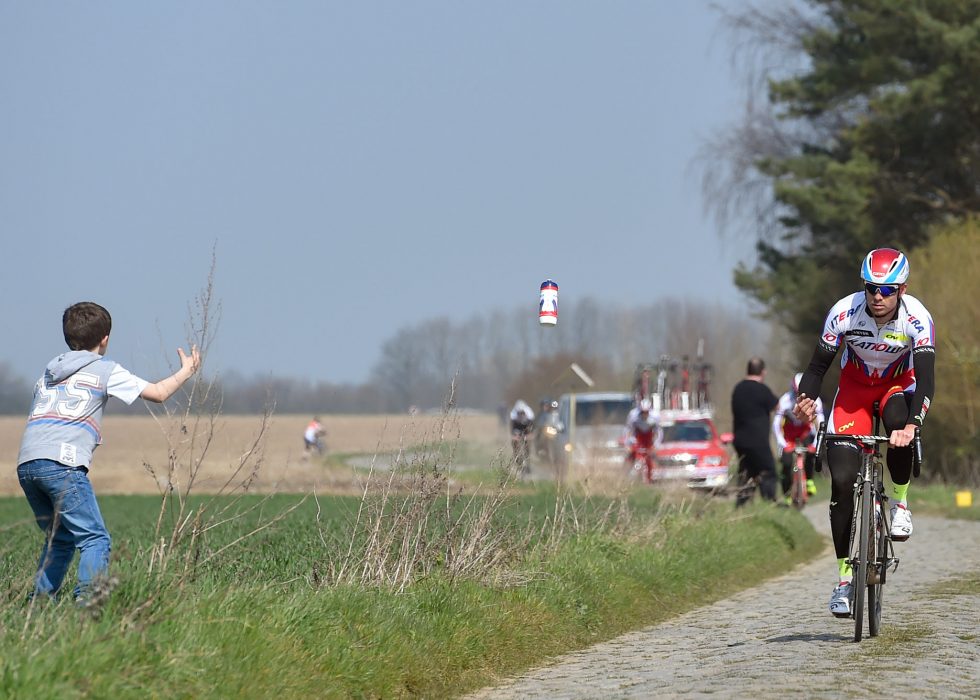 FORBILDER: En ung gutt mottar en vannflaske fra Alexander Kristoff under rekognosering foran Paris-Roubaix. Nå blir reglene for flaskekasting strengere. FOTO: Tim De Waele/TDWSPORT.COM