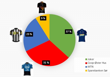 Team Joker og Team Coop-Øster Hus har begge bidratt med veldig mye poeng. Begge lag har hatt flere ryttere som har hentet inn mye poeng. Team Sparebanken Sør har ikke vist samme bredde, verken blant ryttere eller rittprogram, men Andreas Vangstad er blant årets åpenbaringer og en viktig brikke for Norges flotte ranking.