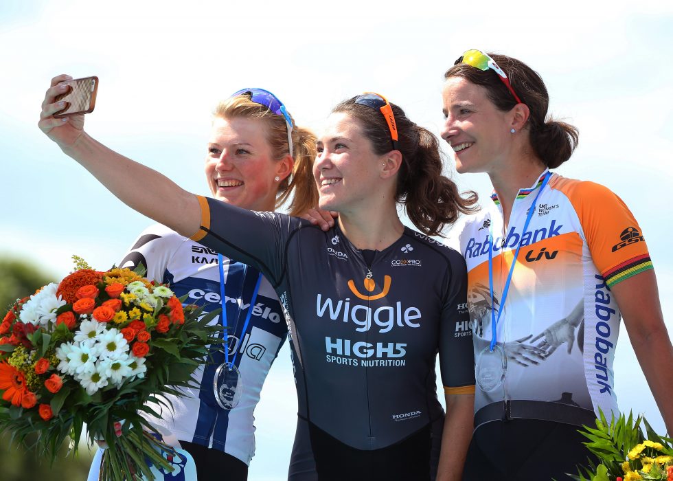 I PARIS: Vinner av La Course i 2016, Chloe Hosking, flankert av Lotta Lepistö og Marianne Vos.