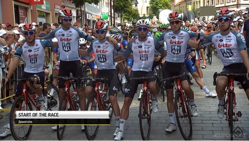 FØR START: Lotto Soudal-rytterne minnes Bjorg Lambrecht. Foto: Skjerdump/Eurosport Player