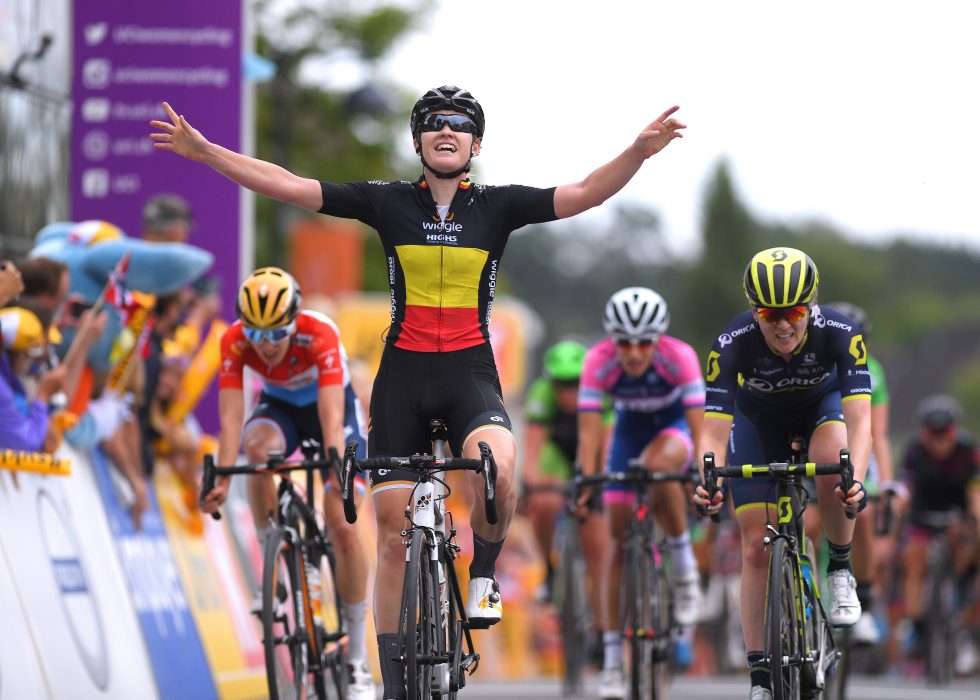BELGISK MESTER: Jolien D'Hoore spurtet inn til seier i Mysen. Emilie Moberg ble nummer ni på fredagens etappe i Ladies Tour of Norway. FOTO: Tim De Waele/TDWSPORT.COM