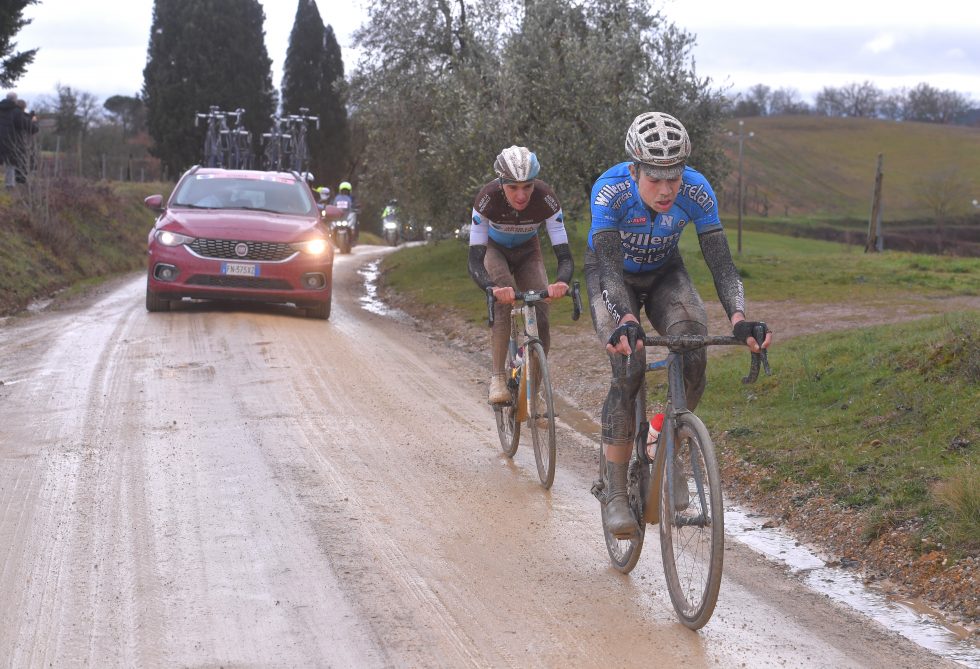 GJØRMETE: Strade Bianche ble nesten som et cyclocrossritt med all gjørmen. I hvert fall viste Van Aert seg glimrende fram, til tross for krampene som tok overhånd i avslutningen opp til Piazza del Campo. Foto: Tim de Waele/Getty Images