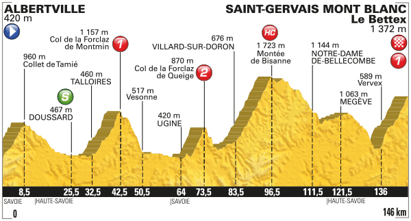 For her stiger profilen allerede fra starten av, med den ukategoriserte Col de Tamié på vei ut av den gamle OL-byen Albertville. Veiene er smale på vei opp, og svært raske på vei ned. Dette kan være gunstig terreng for lag med skumle hensikter og krefter nok til å skape furore.