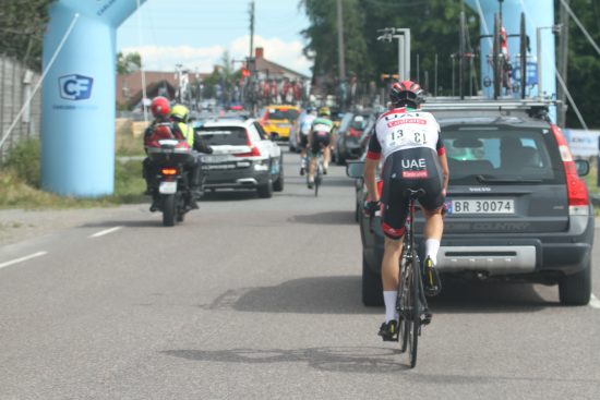NEDE I BILKØEN ETTER VELT: Sven Erik Bystrøm var en av gigantene som gikk ned i velt i langesonen. Dette bildet er tatt når han prøver å kjøre seg opp igjen via Hotvedtveien. FOTO: Jarle Fredagsvik, procycling.no