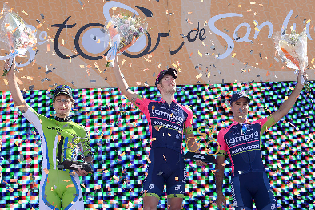 PÅ PODIET MED MODOLO: Peter Sagan, Sacha Modolo og Maximilian Ariel Richeze på podiet under Tour de San Luis i 2014. FOTO: Tim de Waele/Corbis via Getty Images)