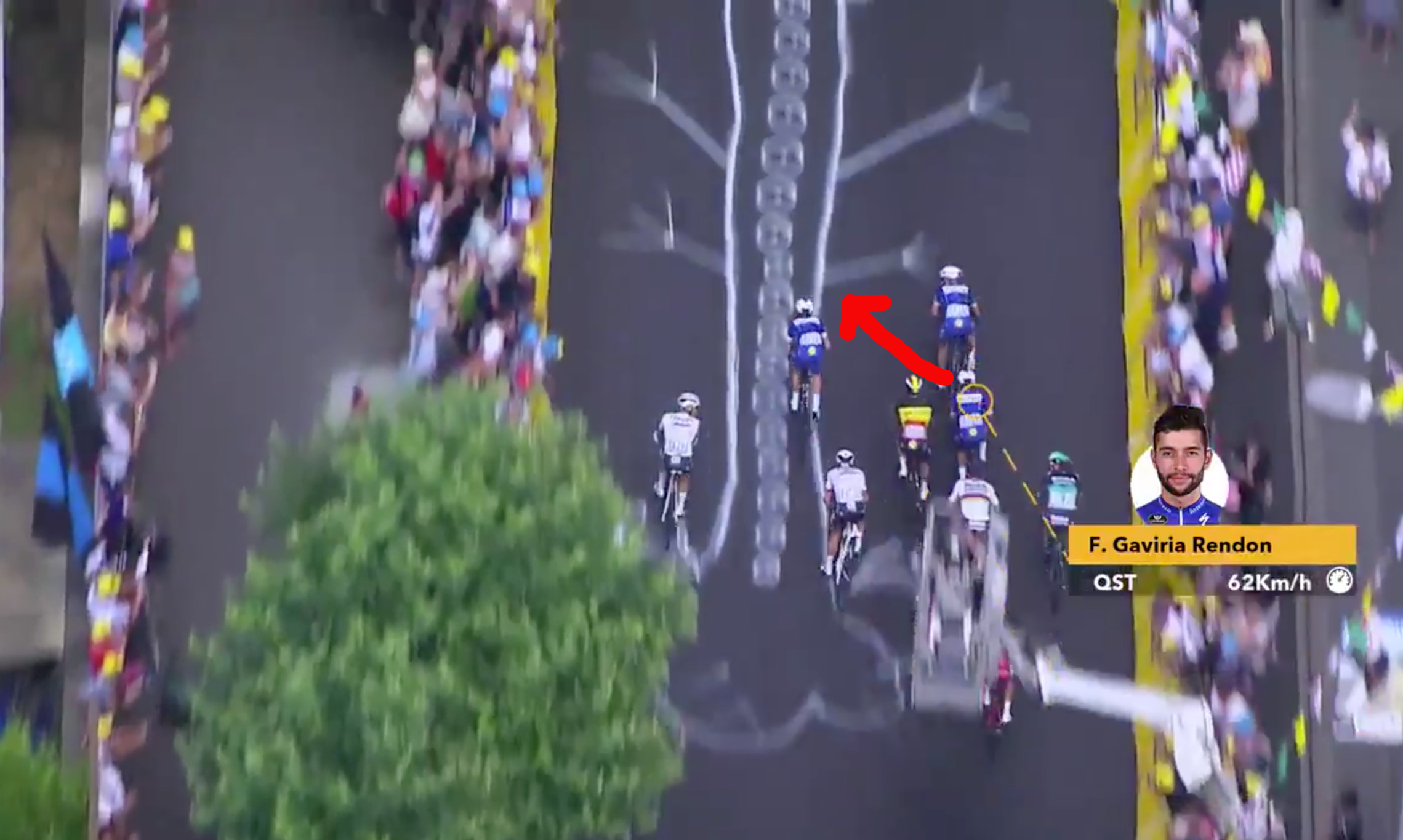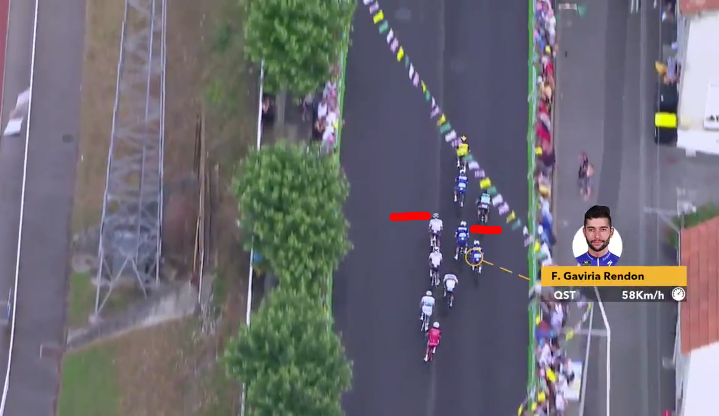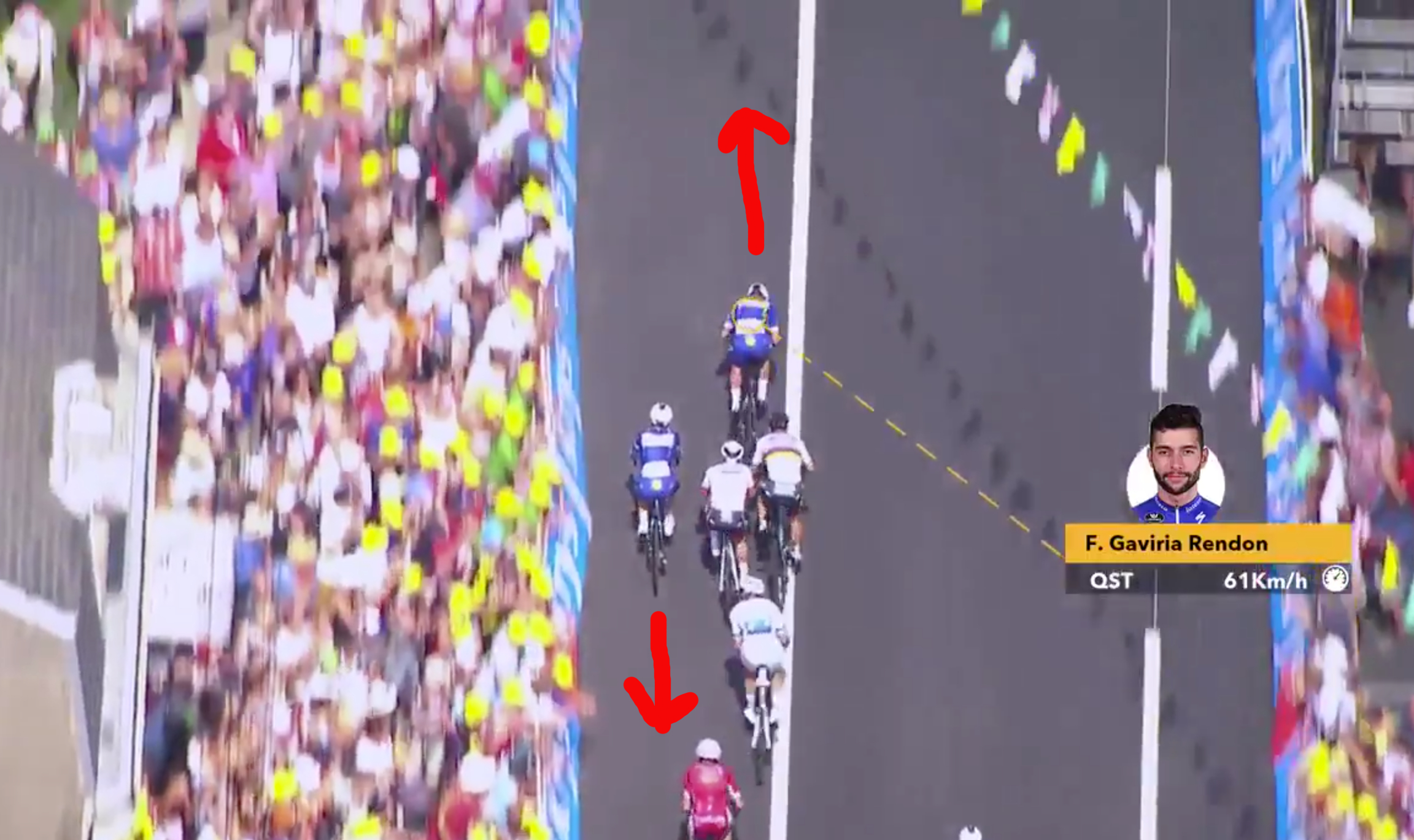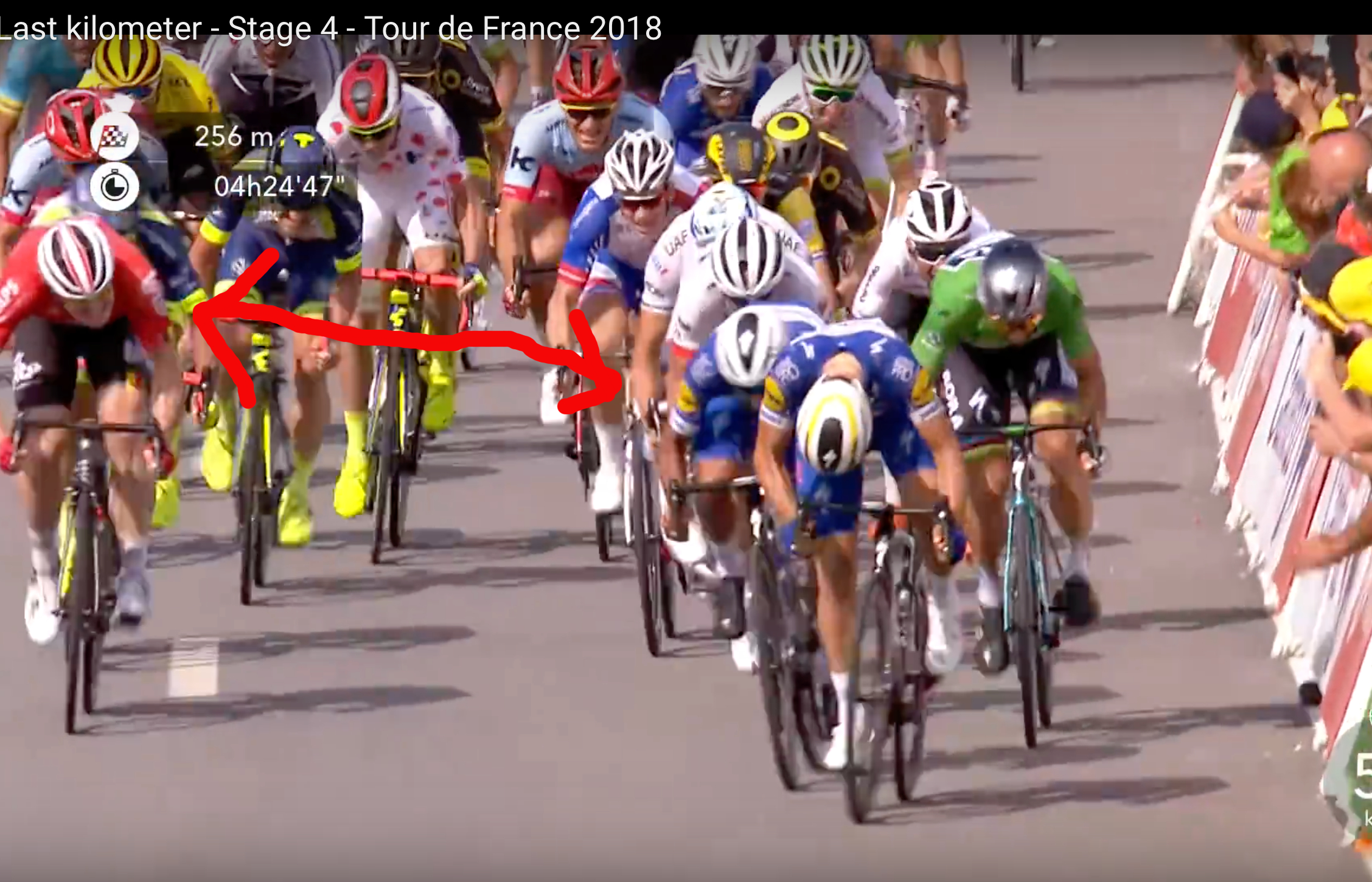 Greipel velger å gå ut tidlig mot høyre og starter spurten sin med 285 meter igjen til streken. Det oppfatter Gaviria som holder igjen i 20 meter til før han skal avslutte oppdraget med 250 meter igjen til streken.