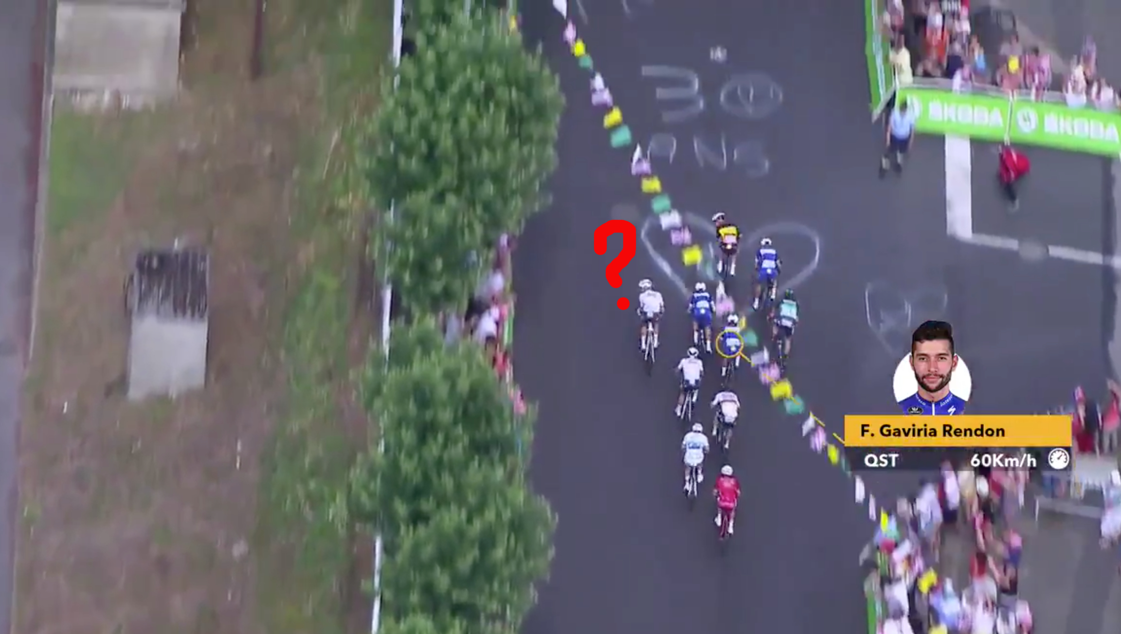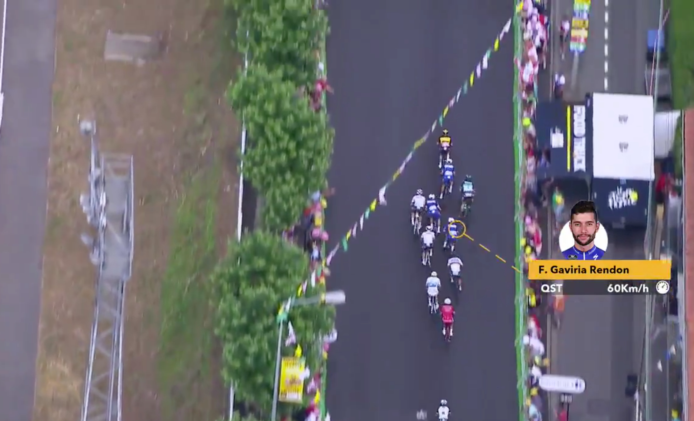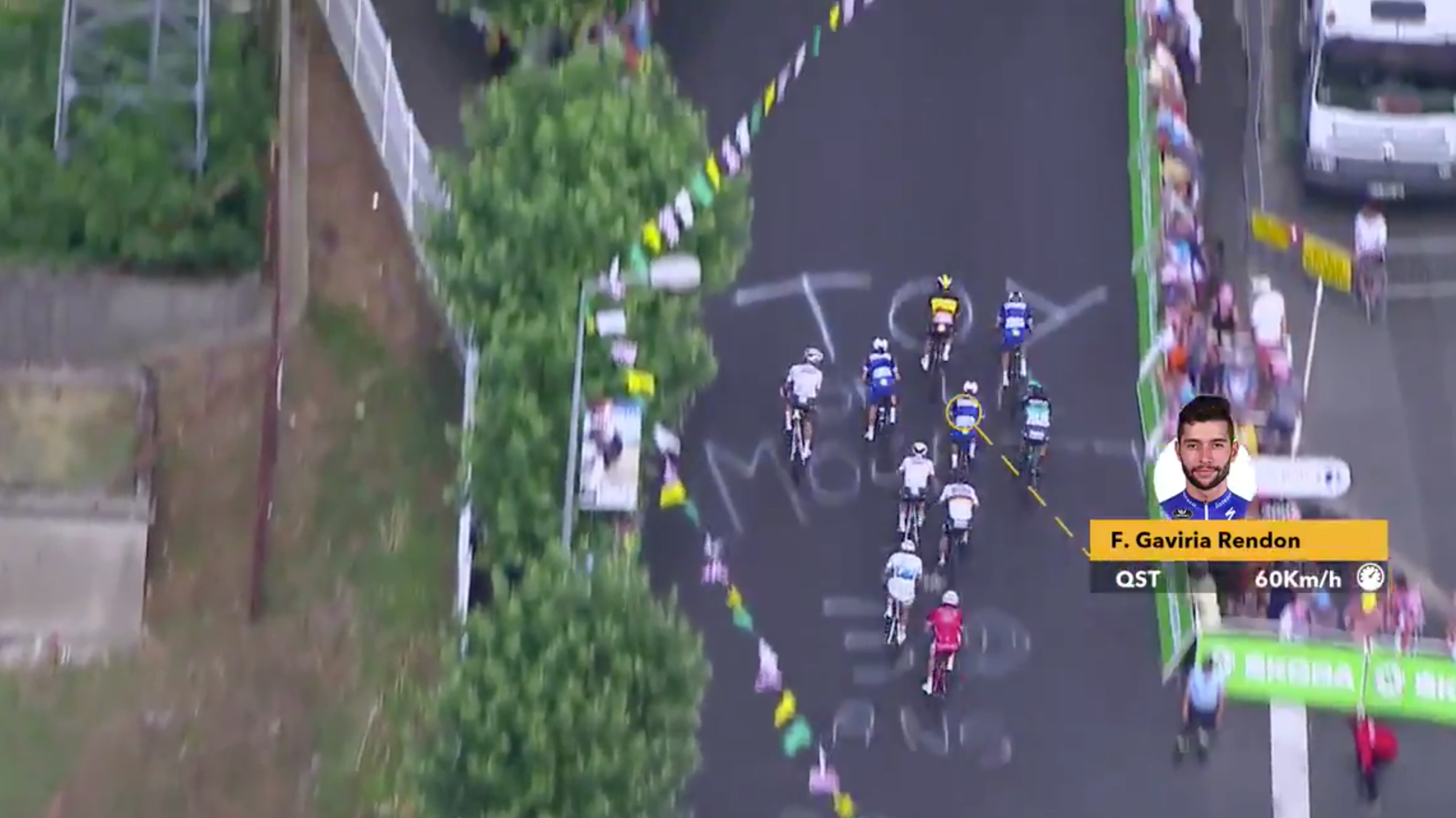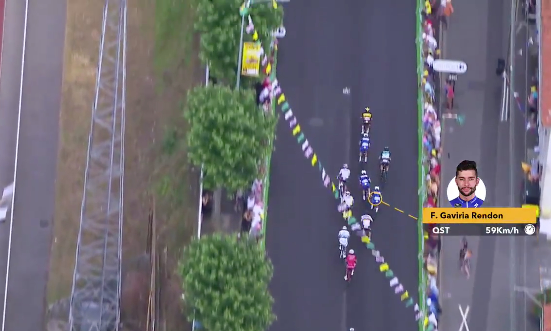 Greipel velger å gå ut tidlig mot høyre og starter spurten sin med 285 meter igjen til streken. Det oppfatter Gaviria som holder igjen i 20 meter til før han skal avslutte oppdraget med 250 meter igjen til streken.