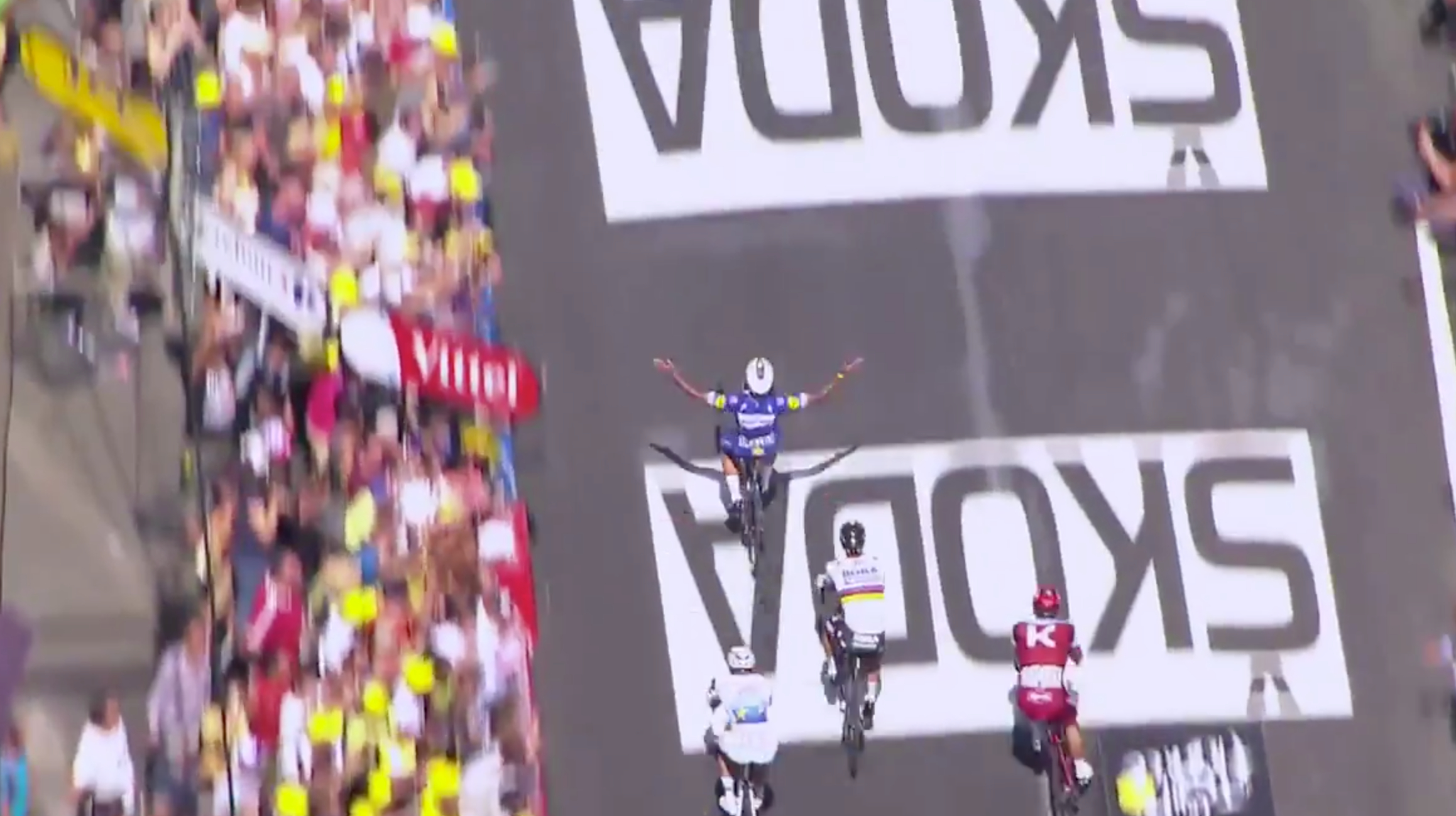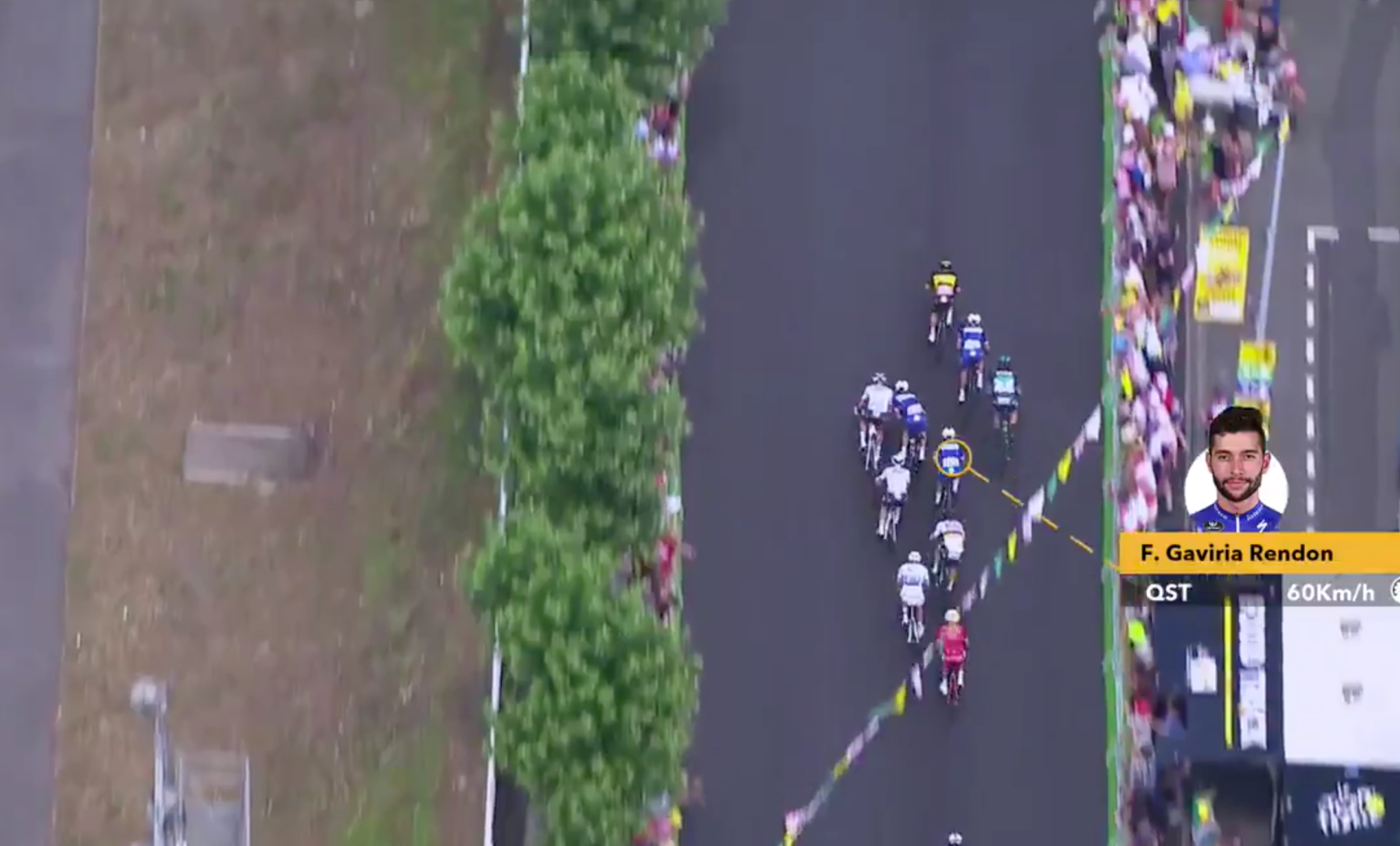 Det ble tynnet ut til spurt i avgrenset gruppe, og der satt Quick Step godt i det med Philippe Gilbert, Bob Jungels, Yves Lampaert og opptrekker Richeze rundt Gaviria inn mot mål.