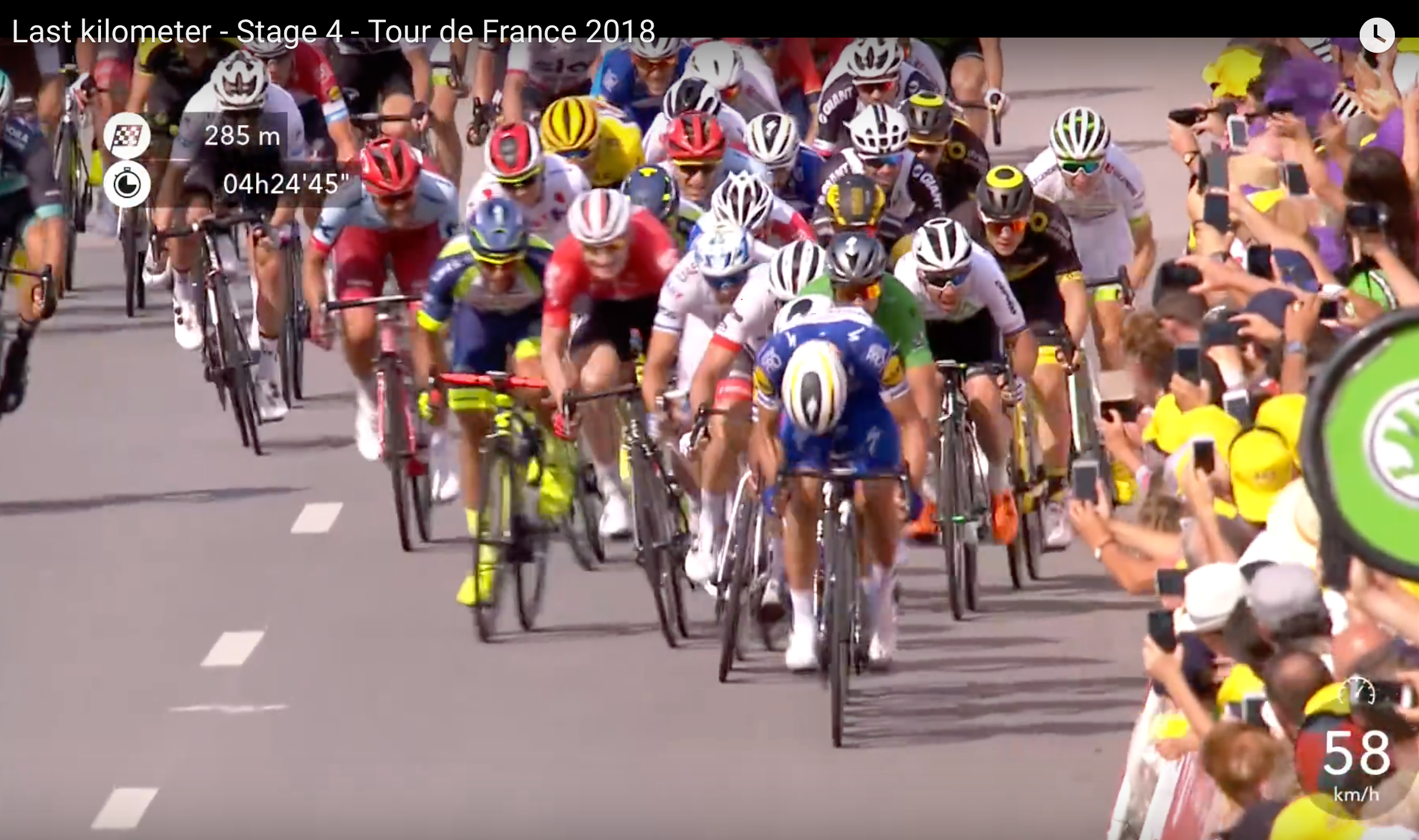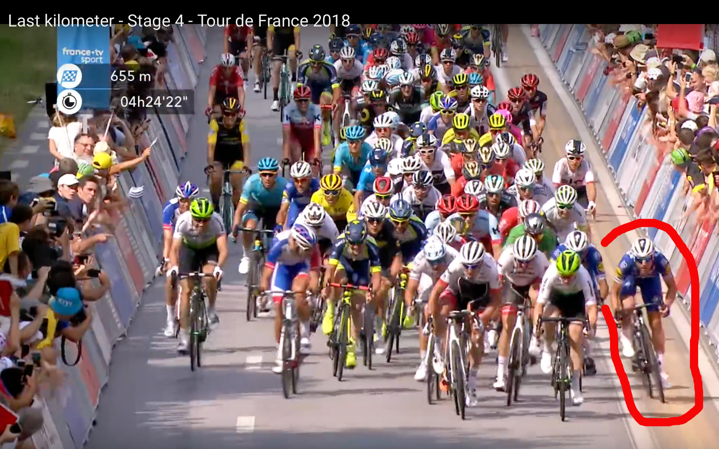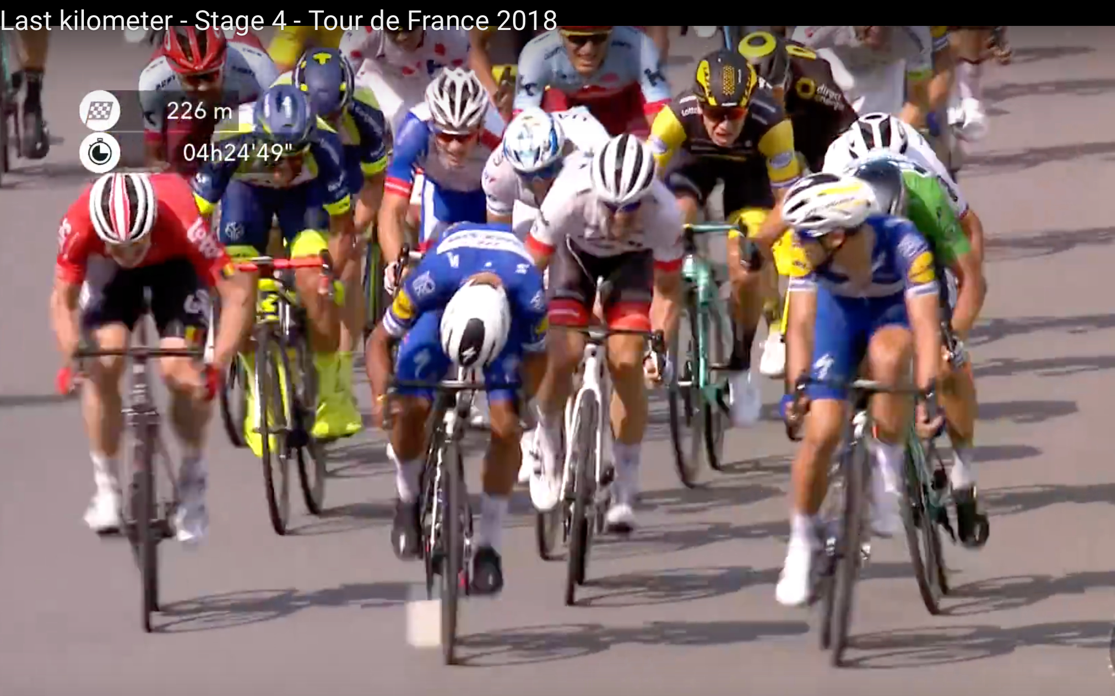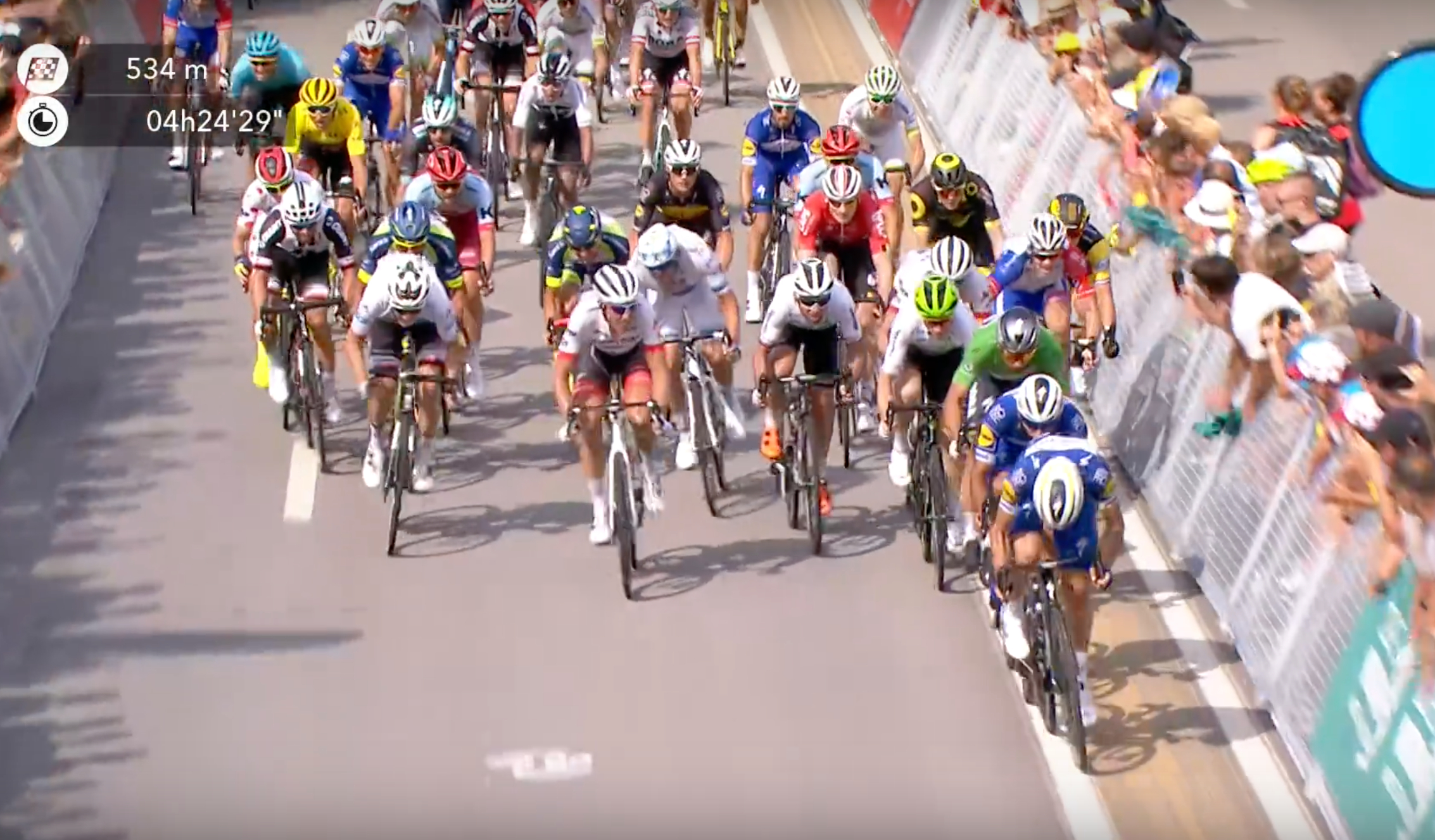 Tyskeren flakker inn mot hjulet til Richeze, mens Yves Lampaert slipper seg som en fallen frukt gjennom klynga. Gaviria går rundt på høyresiden og utnytter vindskyggen fra Richeze før han setter i gang egen spurt. Sagan kniper så vidt bakhjulet hans foran Degenkolb, som nå er helt uten rytme og faller helt ned til en åttendeplass i spurten.