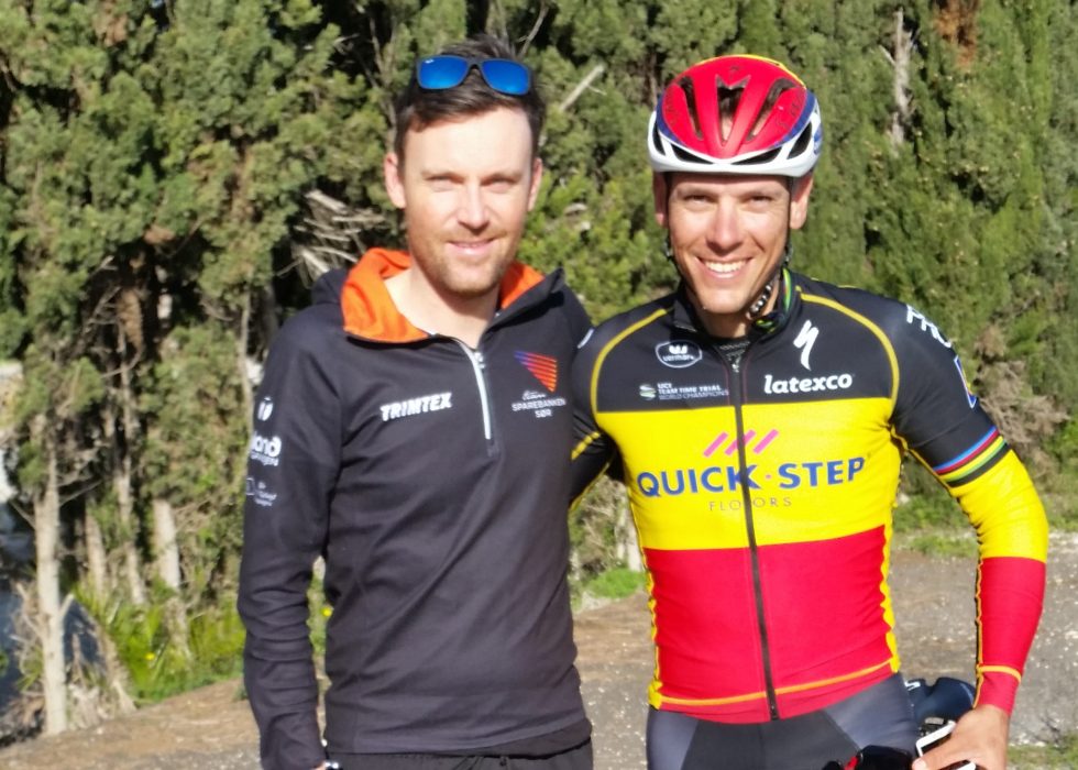 CELEBERT BESØK: Philippe Gilbert (til h.) dukket opp opp på Team Sparebanken Sør-trening. Her med sportsdirektør Stian Remme. FOTO: Privat