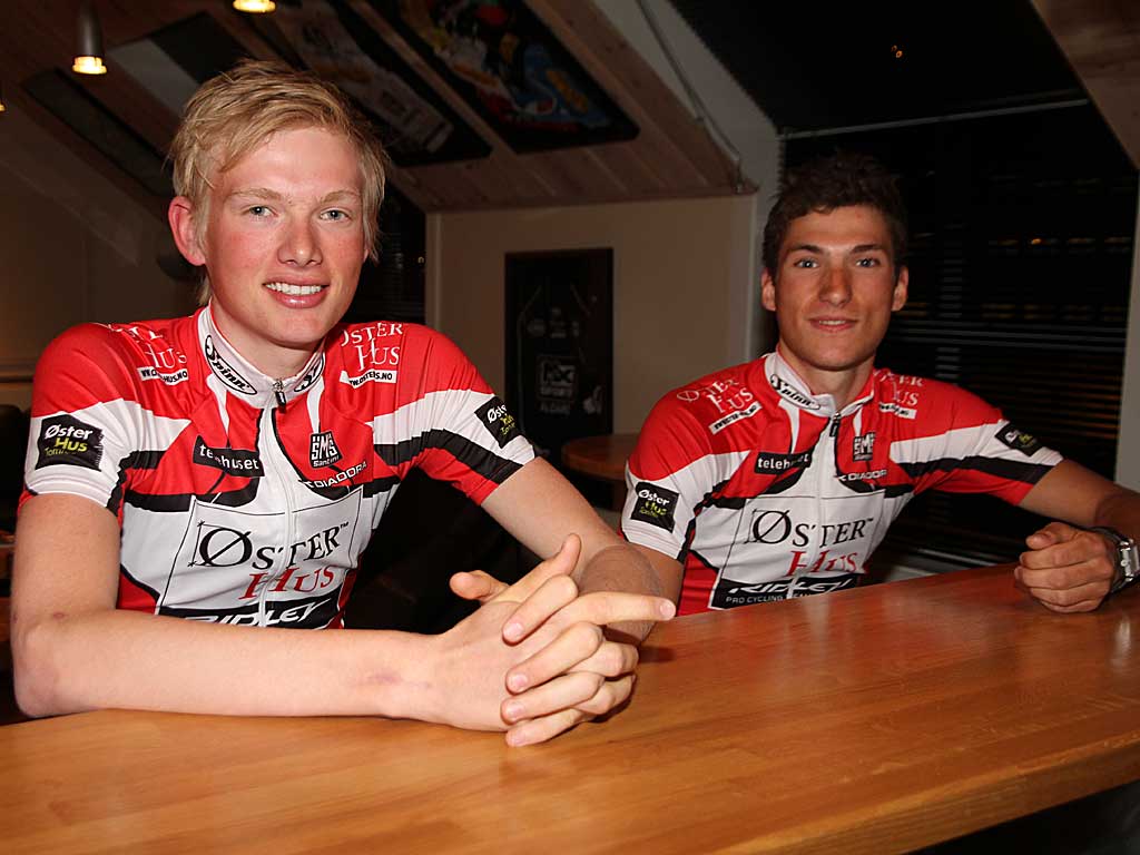 PROFFE KOMPISER: Her er Fredrik Strand Galta og Sven Erik Bystrøm avbildet sammen foran 2013-sesongen. Neste år er begge to proffer. FOTO: Jarle Fredagsvik, procycling.no