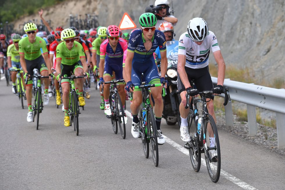 Bak i hovedfeltet satt Froome isolert, og hadde en forferdelig dag på sykkelen. På toppen av bakken hadde han tapt 2:40 til Quintana, og er nå 3:37 bak i sammendraget.