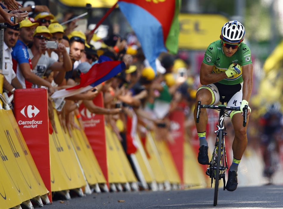 MIN TRØYE: Peter Sagan på vei inn til andreplass etter å ha vært en del av et stort brudd på den 16. etappen til Gap i fjorårets tour. Sagan har ikke vunnet en etappe i rittet siden 2013, men har til gjengjeld blitt kongen av poengkonkurransen. Foto: REUTERS/Stefano Rellandini