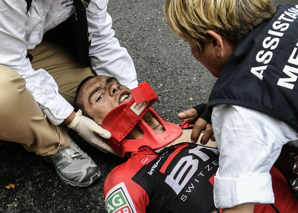 VELTET STYGT: Richie Porte veltet stygt på dagens Tour de France-etappe. Han var ved bevissthet og ble sendt til sykehus umiddelbart. Foto: AFP PHOTO / PHILIPPE LOPEZ