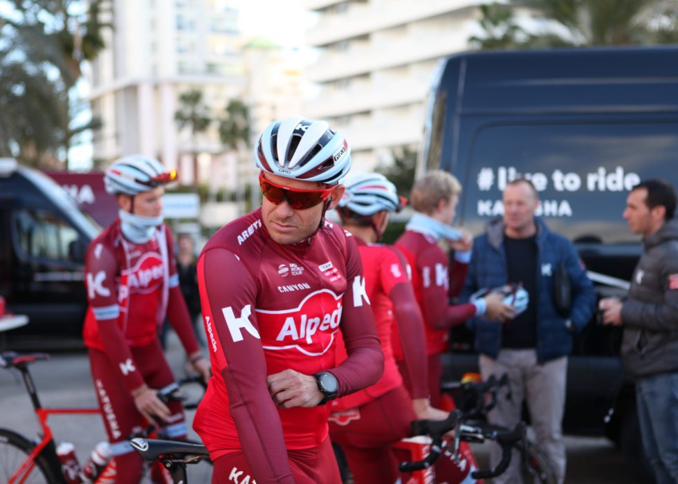 KLARGJØRING: Katusha-Alpecin-rytterne fikser tøy og utstyr før onsdagens trening i Calpe. FOTO: procycling.no.