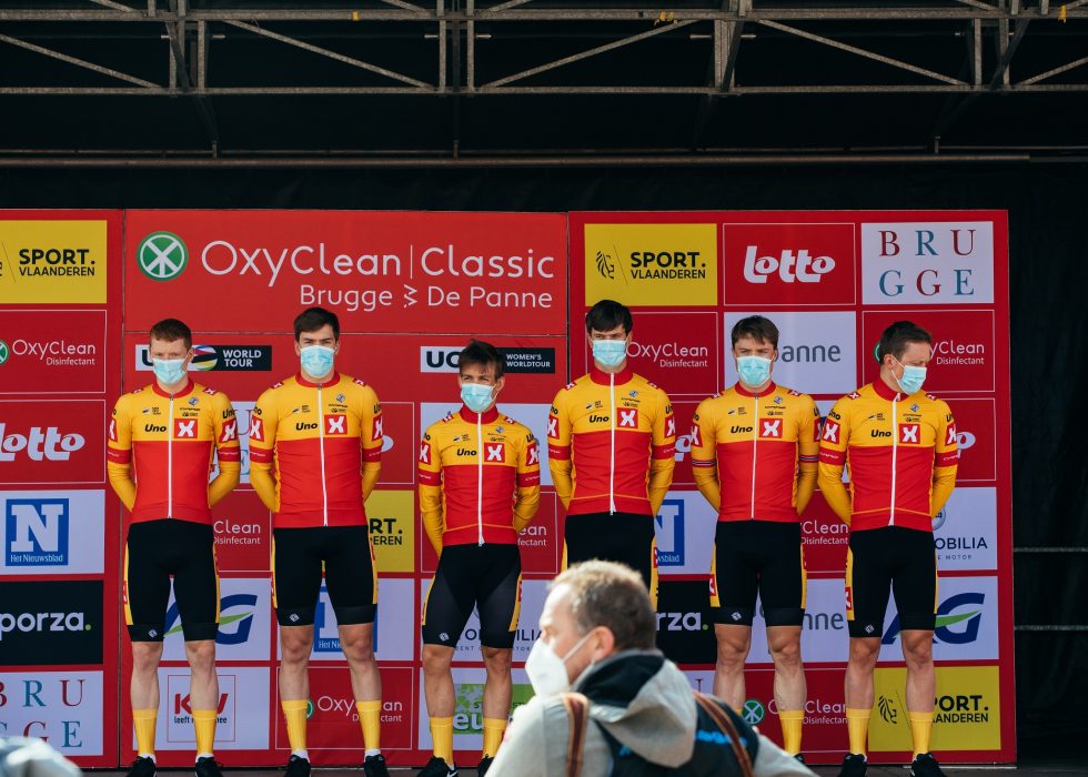 FØRSTE PÅ WORLDTOUR: Rodenberg, Resell, Halvorsen, Wærsted, Tiller og Skaarseth ble onsdag de seks første Uno-X-rytterne i et WorldTour-ritt. Foto: WordUp Projects